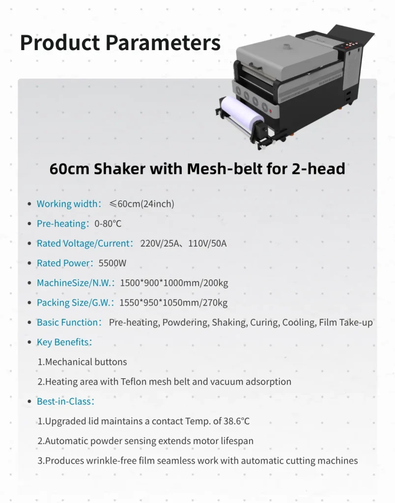 In a commercial Direct-to-Film (DTF) workflow, your printer is only as fast as your curing process. If you are operating an industrial 60cm dual-head (2-head) DTF printer, relying on manual powdering or an underpowered, narrow shaker will create massive production bottlenecks, inconsistent curing, and wasted labor.