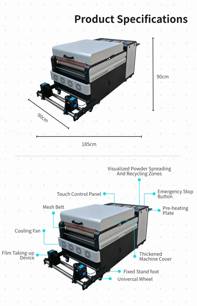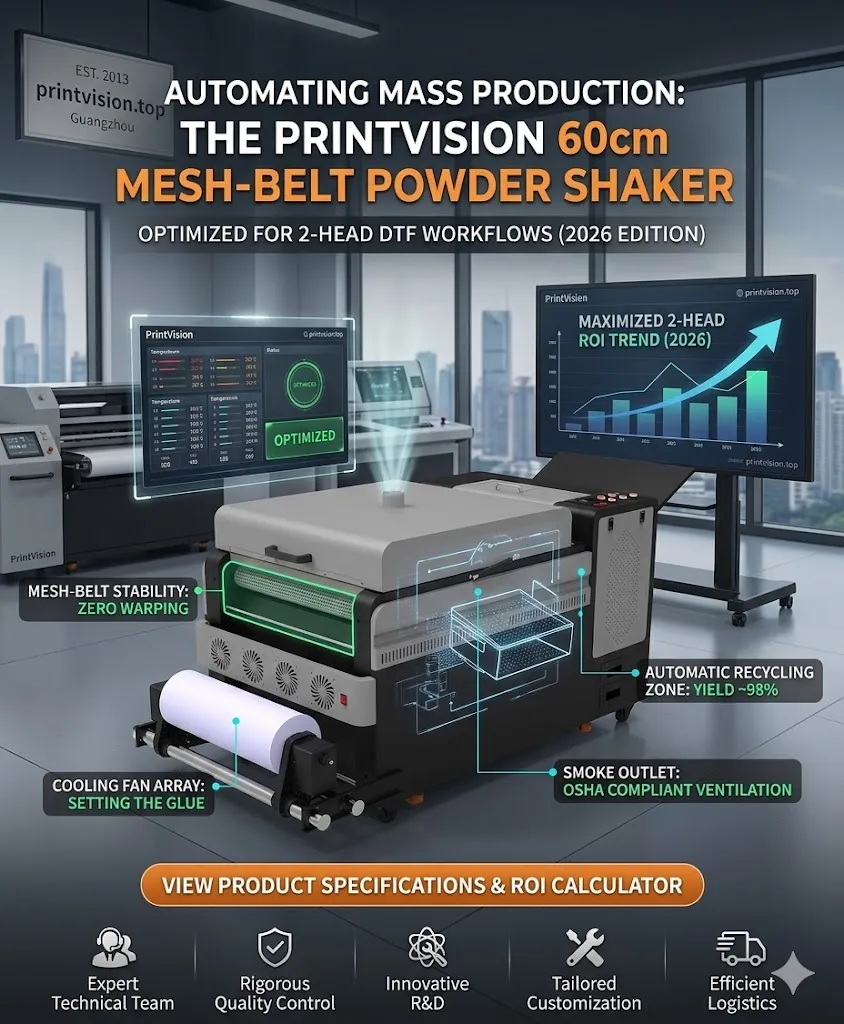 The PrintVision 60cm Powder Shaker with Built-in Purifier represents the future of DTF post-processing. It is not just a curing oven; it is a complete, self-contained finishing department that protects your profit margins, your employees, and the environment.
